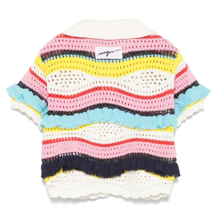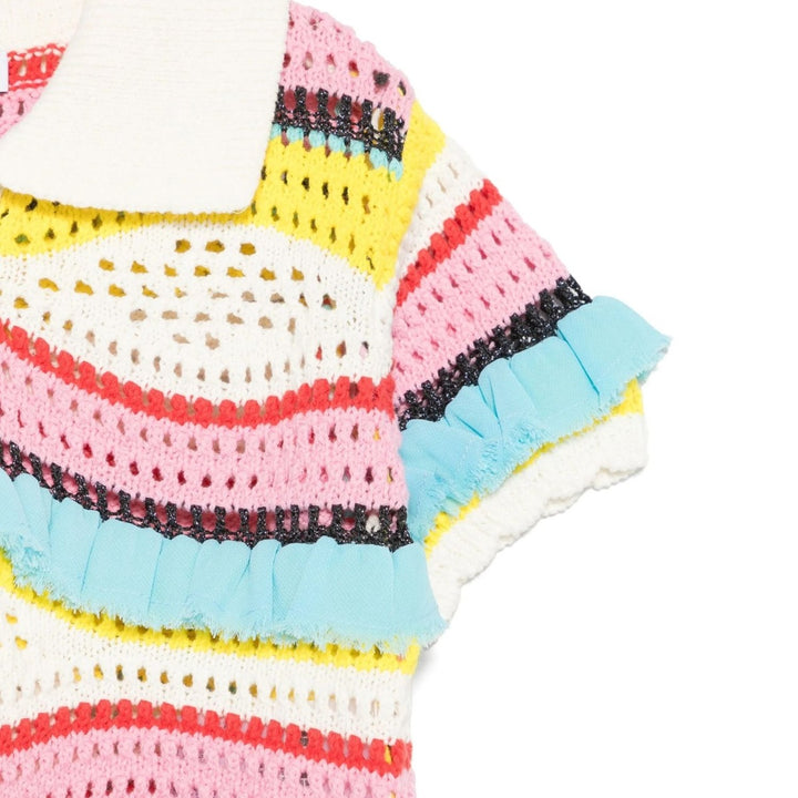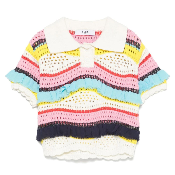 Chic and playful, this almond beige knitted polo top from MSGM Kids brings a fresh twist to classic style. It features a horizontal stripe pattern with subtle lurex detailing for a touch of sparkle, while ruffled accents add a fun, feminine flair. Finished with a front button placket, this soft cotton-blend piece is perfect for dressing up or down.