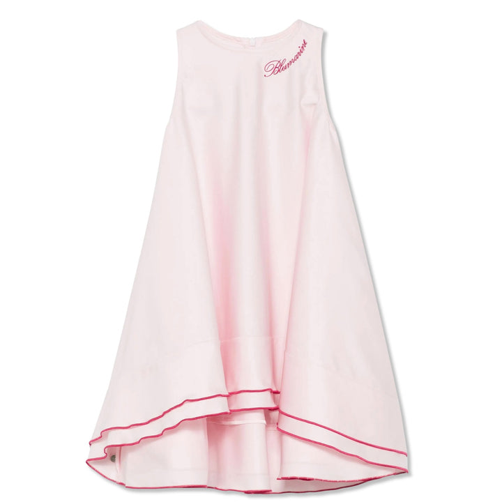 This light pink sleeveless dress is a perfect blend of elegance and playful charm. Designed with a flowy A-line silhouette, it drapes beautifully for a soft, feminine look. The high-low hemline adds movement and features contrast pink piping, giving