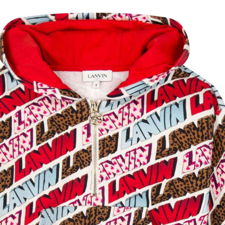 Girls hooded sweatshirt by French designer Lanvin, patterned with red and Blue logos on a ivory background. Inspired by the adult collection, it has a useful pouch pocket and ribbed trims. It is made in comfortable mid-weight jersey with a red lining