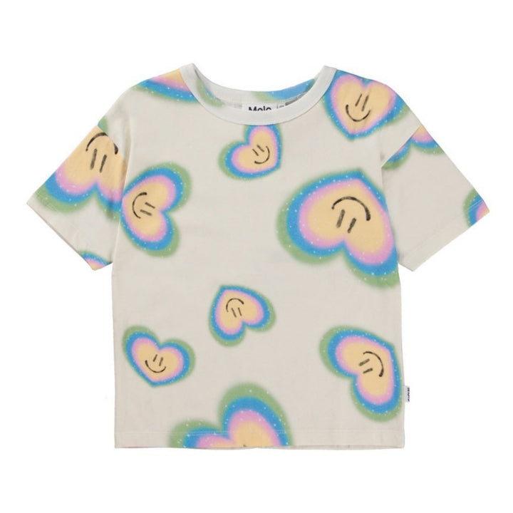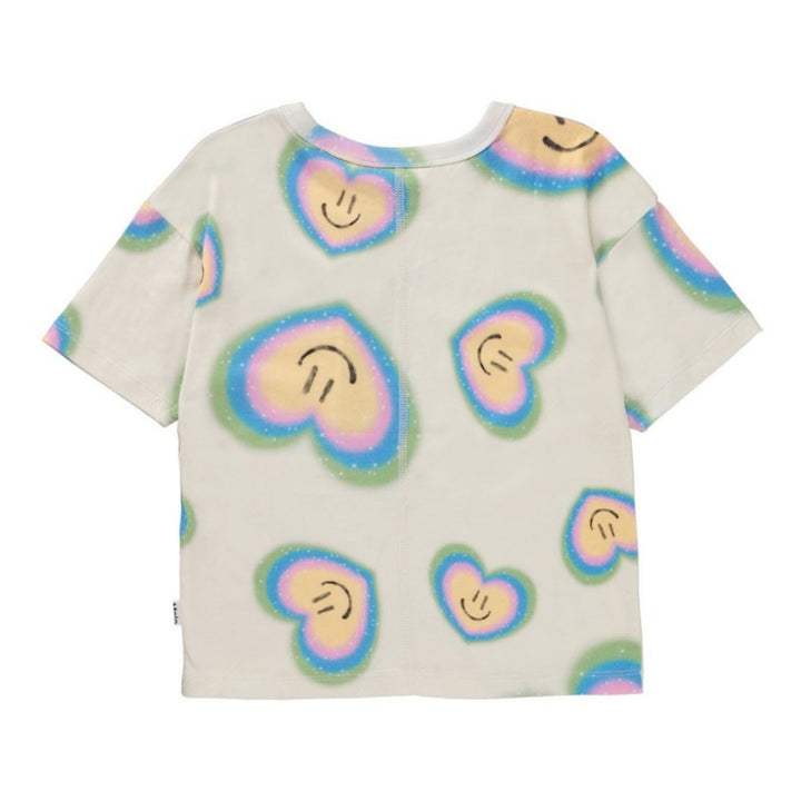 Off-white t-shirt in an all over aura heart print. Imagine that everything has an aura- people, plants and animals. The print is of aura hearts that are glowing with colours, smiles and love. Aura colours are like the colours of the rainbopw and refl