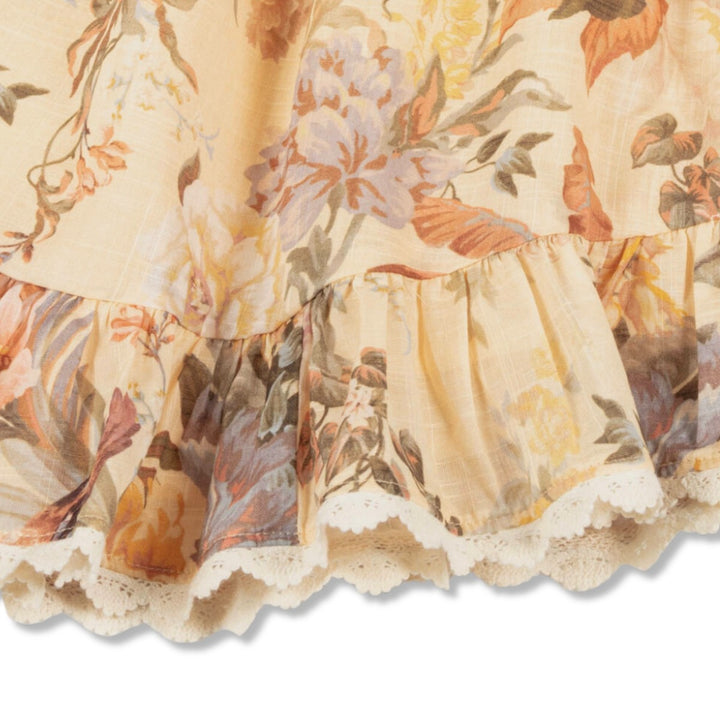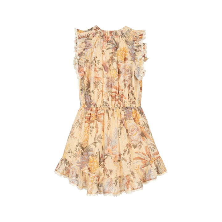 Gorgeous beige dress for girls by luxury brand Zimmermann, made and lined in lightweight cotton voile. A stylish resort wear piece, it has a beautiful floral pattern and a gently elasticated neckline allowing it to slip on easily. The frilled sleeves and hem are trimmed with delicate ivory lace for a pretty finish.