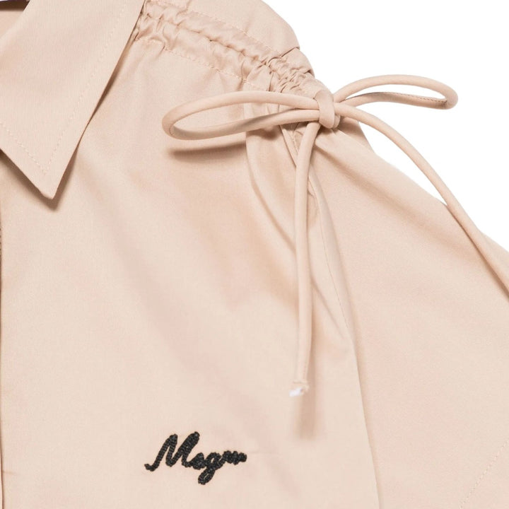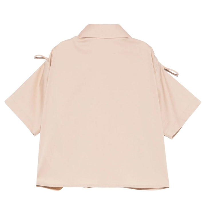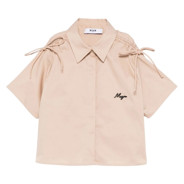 This crisp Beige shirt from MSGM Kids features charming bow-detailed adjustable shoulder straps and a concealed front button fastening. Complete with short sleeves and an embroidered logo at the chest, it blends classic tailoring with playful touches.