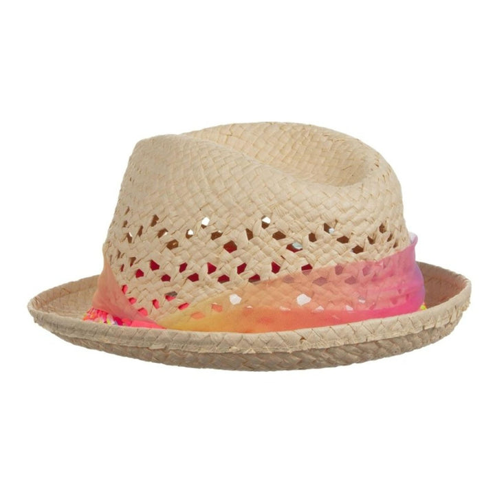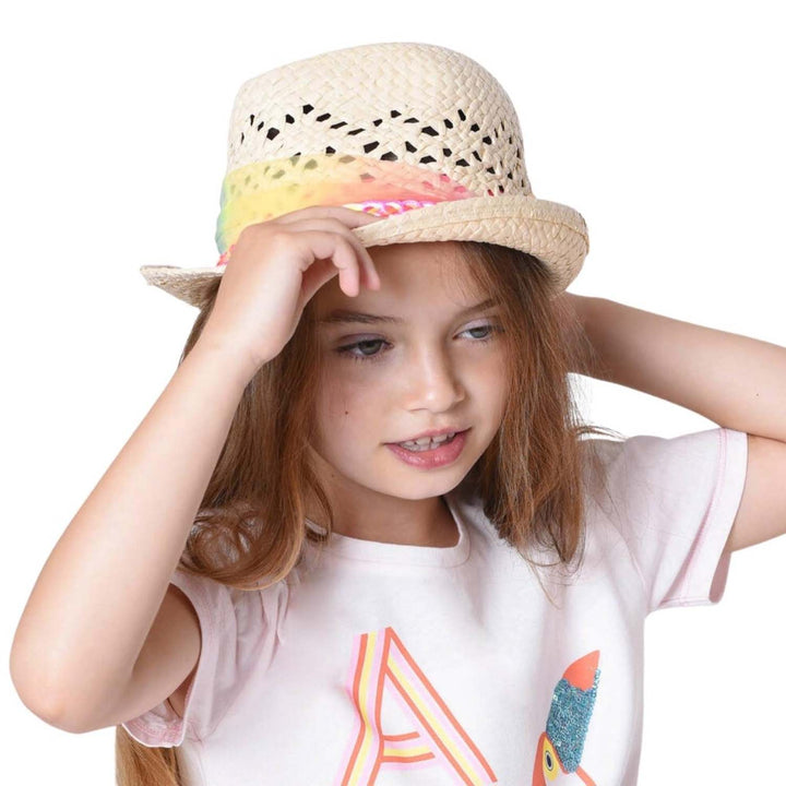 Beige straw hat for girls by Billieblush, with openwork detailing. It has a bright and colourful braided trim, with a soft tulle band in a rainbow ombre effect. This fun trilby style is trimmed with the brands signature striped tab, and has neon pink