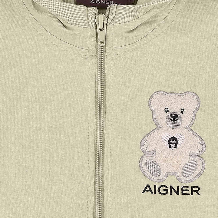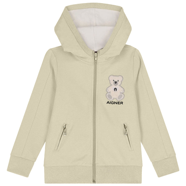 This beige tracksuit combines comfort and cuteness with its soft cotton blend fabric and charming teddy bear logo patch. Perfect for playtime or lounging, it offers a relaxed fit with a stylish twist ideal for everyday wear with a touch of fun.
