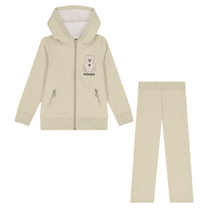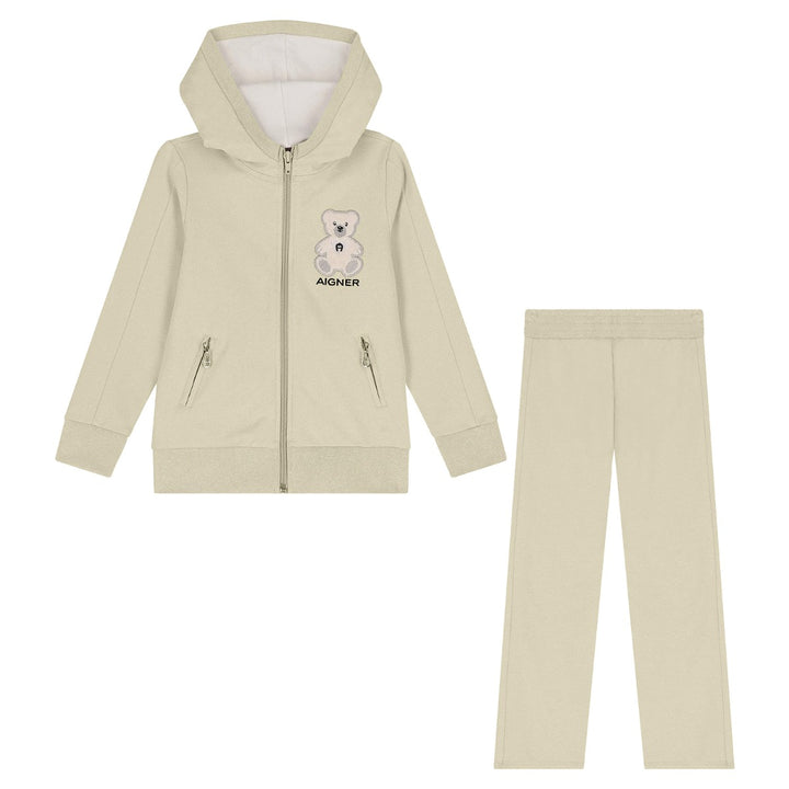 Girls Beige Teddy Bear Logo-Patch Tracksuits