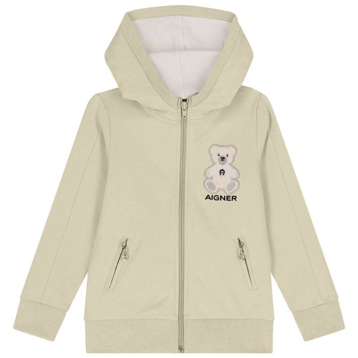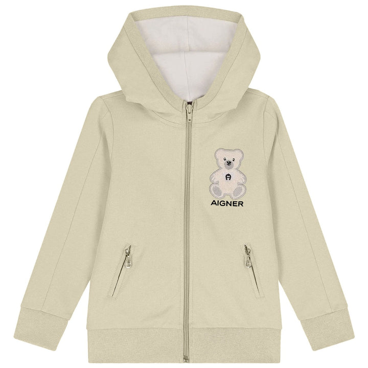 This beige tracksuit combines comfort and cuteness with its soft cotton blend fabric and charming teddy bear logo patch. Perfect for playtime or lounging, it offers a relaxed fit with a stylish twist ideal for everyday wear with a touch of fun.