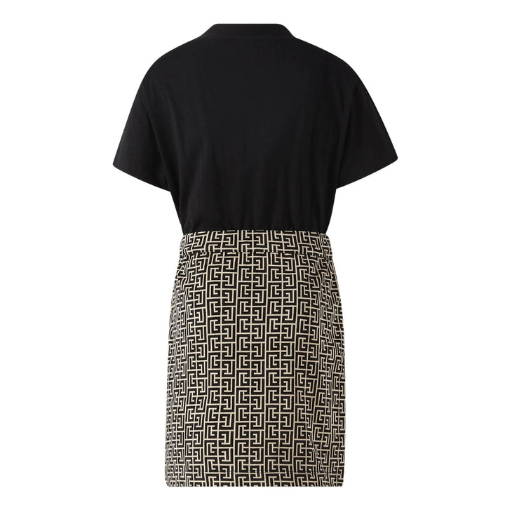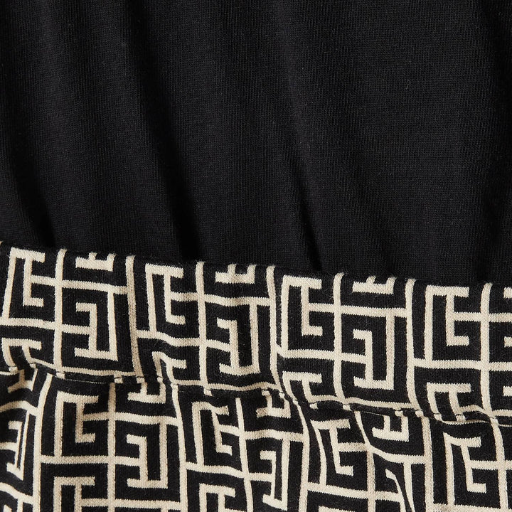 Make a statement with this striking black and beige monogram skirt dress from Balmain. Designed with a sleek black top and a flared skirt featuring the iconic all-over Balmain monogram, this dress blends elegance with modern edge. The fitted bodice,
