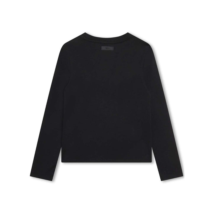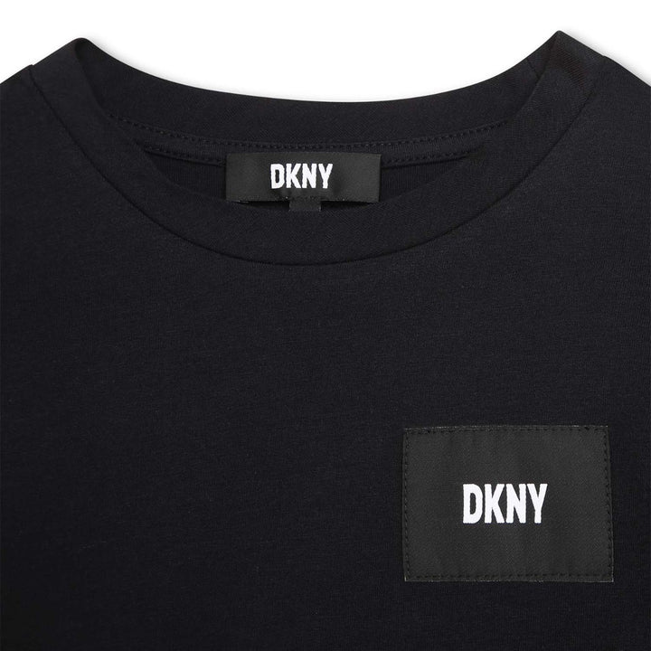 Casual black organic cotton t-shirt for girls by American designer DKNY. Made in comfortable jersey, this useful wardrobe essential has an embroidered black and white logo patch on the chest for a distinctive designer finish.