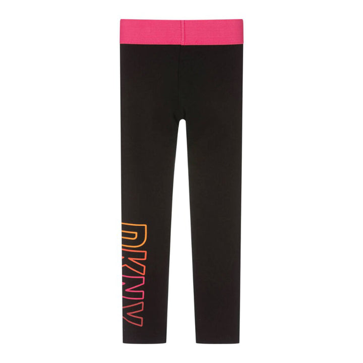 Girls black leggings from DKNY, made in soft organic cotton jersey. They have a bright pink elasticated waistband for a pop of colour and comfort. One leg is printed with pink and orange logo for a designer finish.