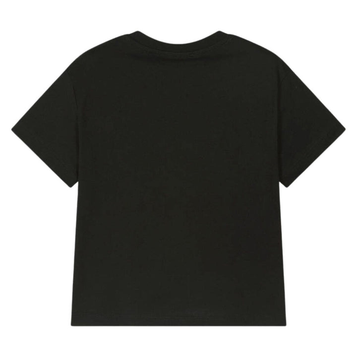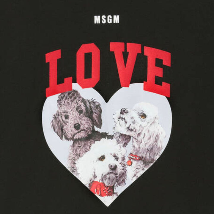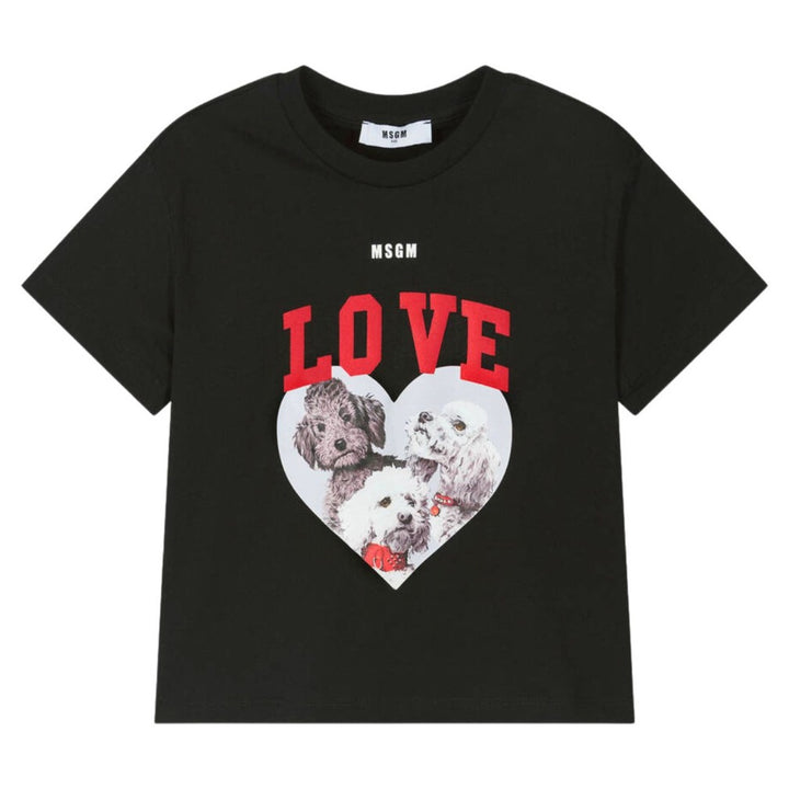 Girls black short-sleeved T-shirt by Italian brand MSGM, made in soft cotton jersey. On the front it has a flocked, red 'Love' slogan, with a black micro logo and a heart-shaped motif with cute puppy graphics.