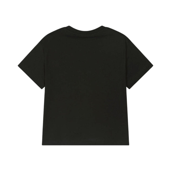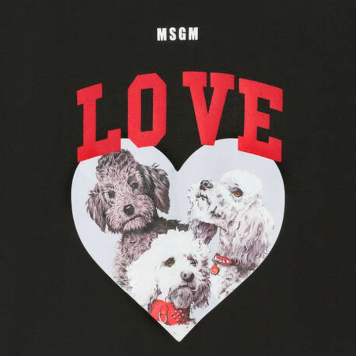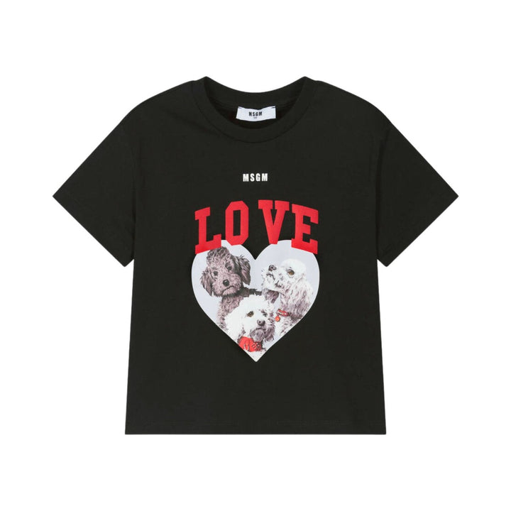 Girls black short-sleeved T-shirt by Italian brand MSGM, made in soft cotton jersey. On the front it has a flocked, red 'Love' slogan, with a black micro logo and a heart-shaped motif with cute puppy graphics.