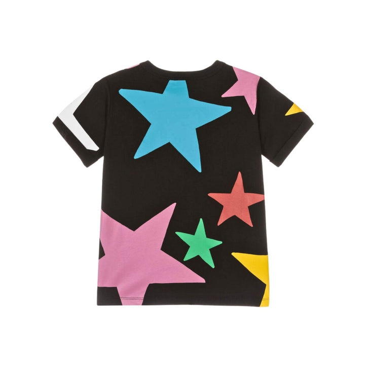 Adding a standout look to her casual wardrobe, this black T-shirt for girls by Stella McCartney Kids is patterned with colourful stars. Made in soft and comfortable organic cotton jersey, it has the British brand's white medallion logo print on the front in white. The Stella McCartney fit can be quite small so choose a size up if you want room to grow.