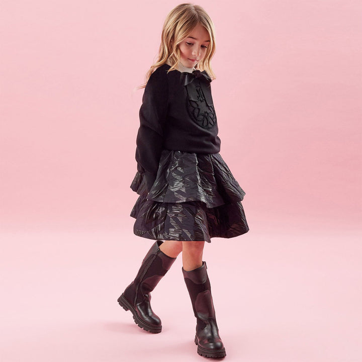 Elegant black organic cotton sweatshirt for girls from luxury designer Elie Saab. This sleek design is made in soft and stretchy, medium-weight jersey with the label's signature monogram logo in black flocking on the front. The crew neckline, cuffs a