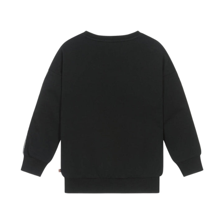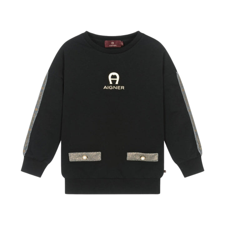 Black cotton sweatshirt for girls by AIGNER, made in soft and comfortable jersey. This casual wardrobe staple is elevated by glittery gold faux pocket trims decorated with shiny gold metal and pearl buttons. A relaxed, dropped shoulder fit, it has glittery, sheer logo tape on the long sleeves and a gold logo print on the chest featuring the signature 'A' horseshoe motif.