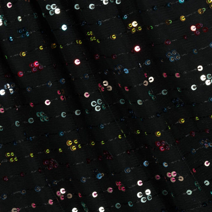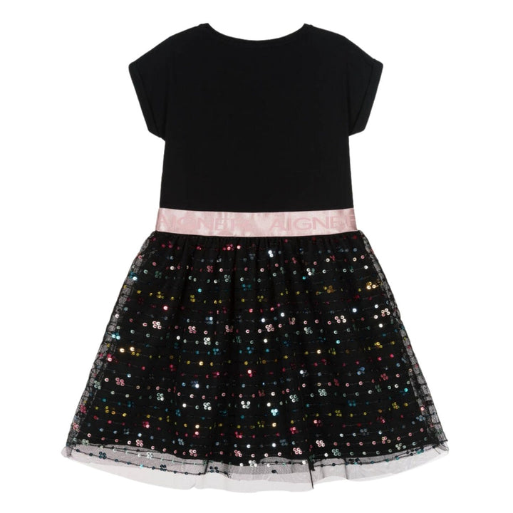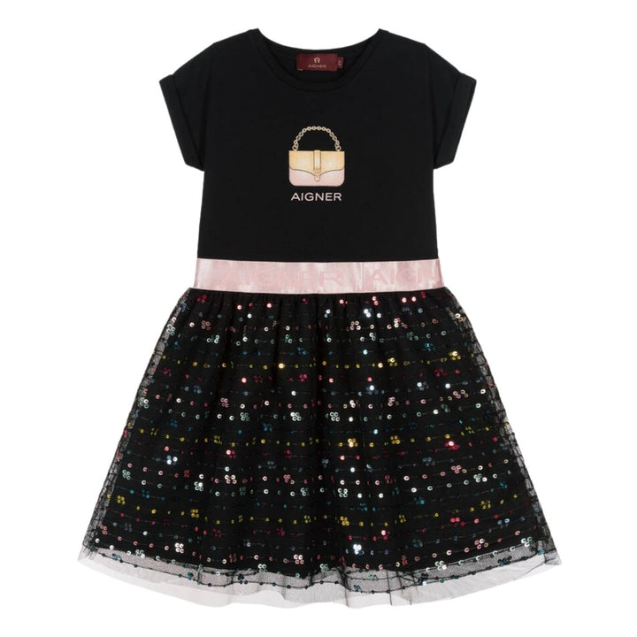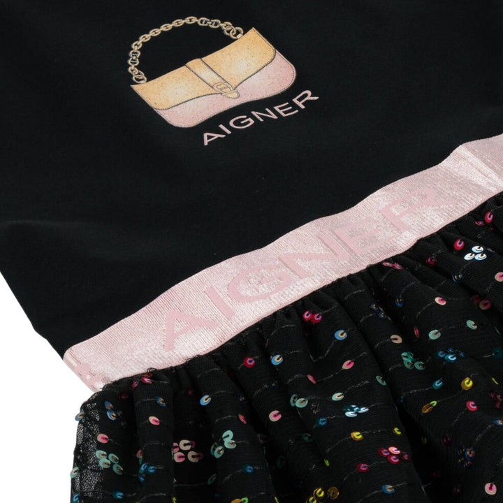 Lovely black dress for girls by AIGNER, with a shimmery gold and pink handbag logo motif on the front. Both comfortable and stylish, the bodice is made in soft jersey, with a contrasting pink logo waistband adding an extra branded touch. Made in soft tulle, the skirt is embellished with colourful sequins for additional sparkle and lined in soft voile for comfort.