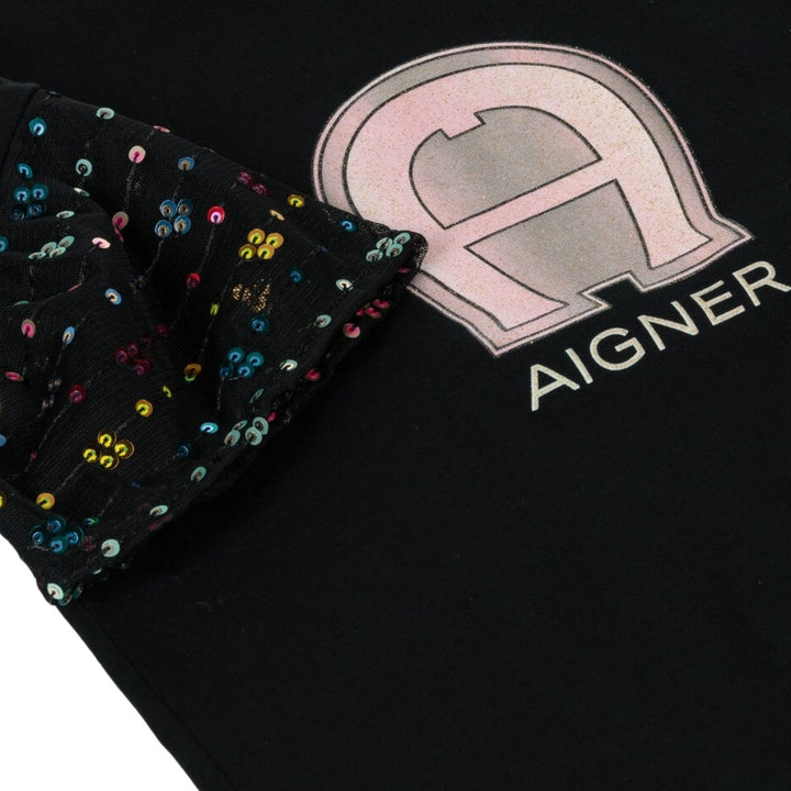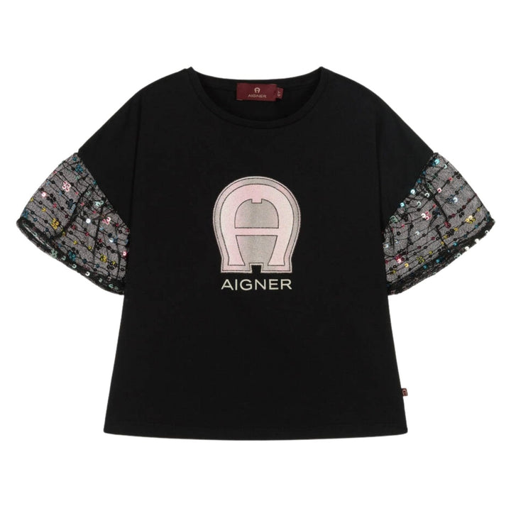 In a stylish boxy fit, this black T-shirt for girls by AIGNER, has a pink and glittery gold 'A' horseshoe logo motif on the front. It is made from soft and comfortable cotton jersey, with semi-sheer tulle sleeves, embellished with colourful sequins.