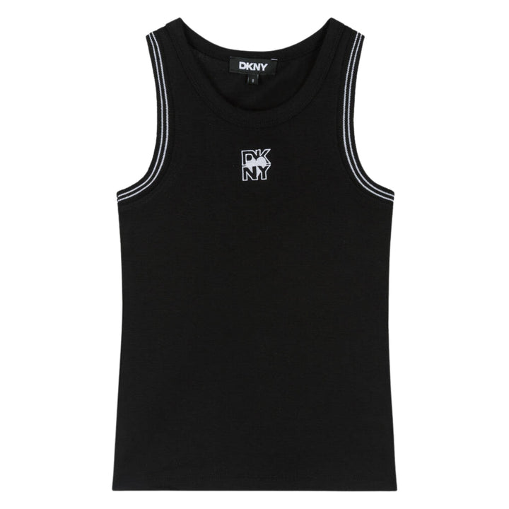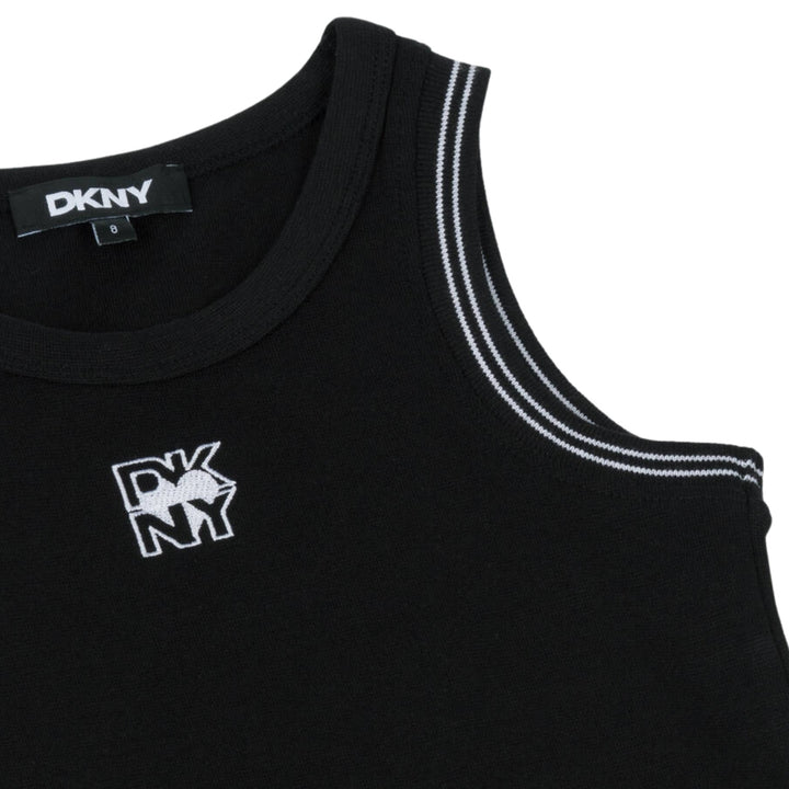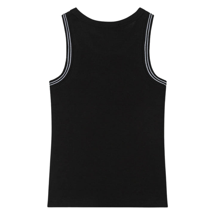 Inspired by the adult collection, this black vest top for girls is by DKNY. Made in soft, comfortable jersey, it has black and white striped, ribbed detailing and an embroidered heart logo on the front.