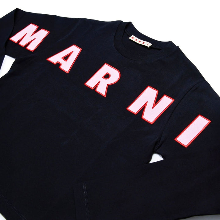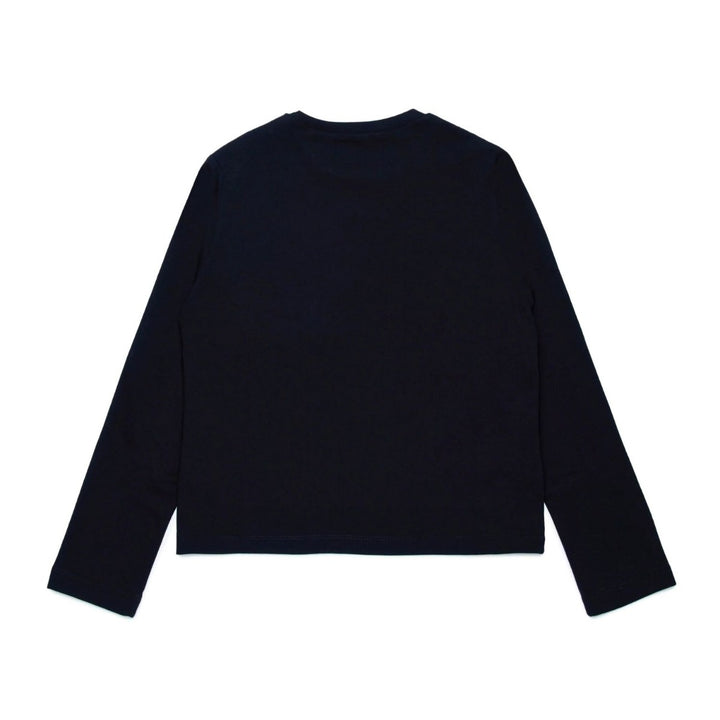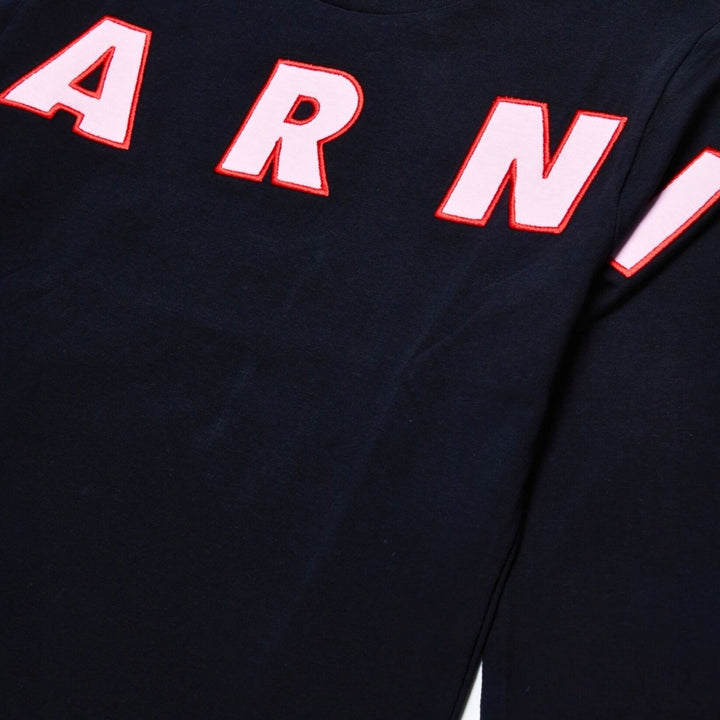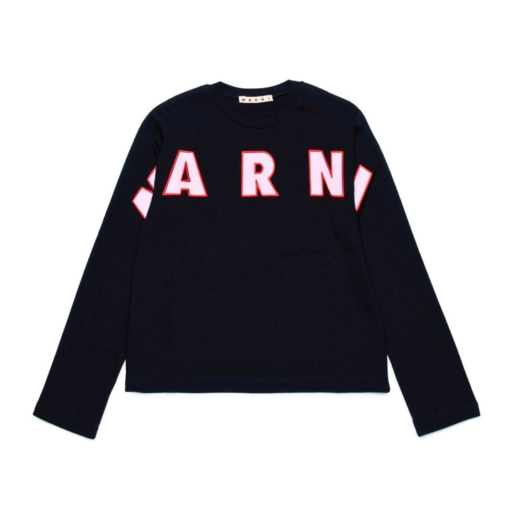Long-sleeved crew-neck jersey T-shirt. Slightly cropped fit with dropped shoulder. Features an institutional logo on the front with contrasting colour embroidery that continues on the sleeves. Made of 100 % cotton. An easy-to-match casual option.