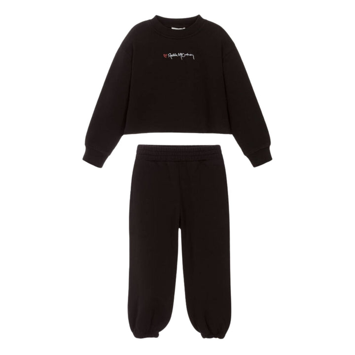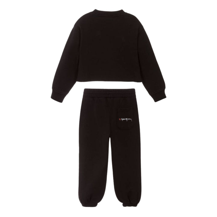 Black tracksuit for girls by Stella McCartney Kids, made in soft, mid-weight cotton jersey with a warm, fleecy inside. Cosy and casual, the boxy fit top has dropped shoulders and an overlocked hem. There is a white logo and heart embroidered on the f