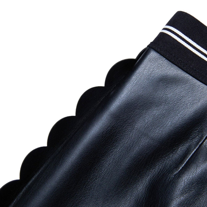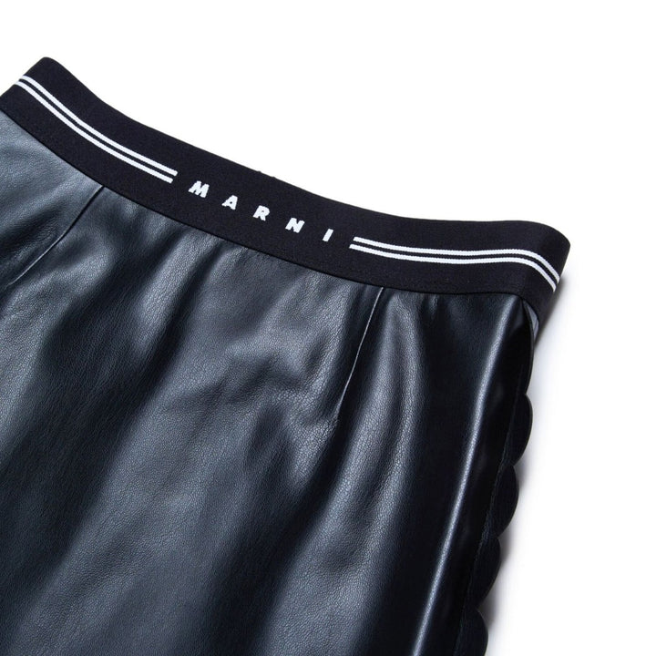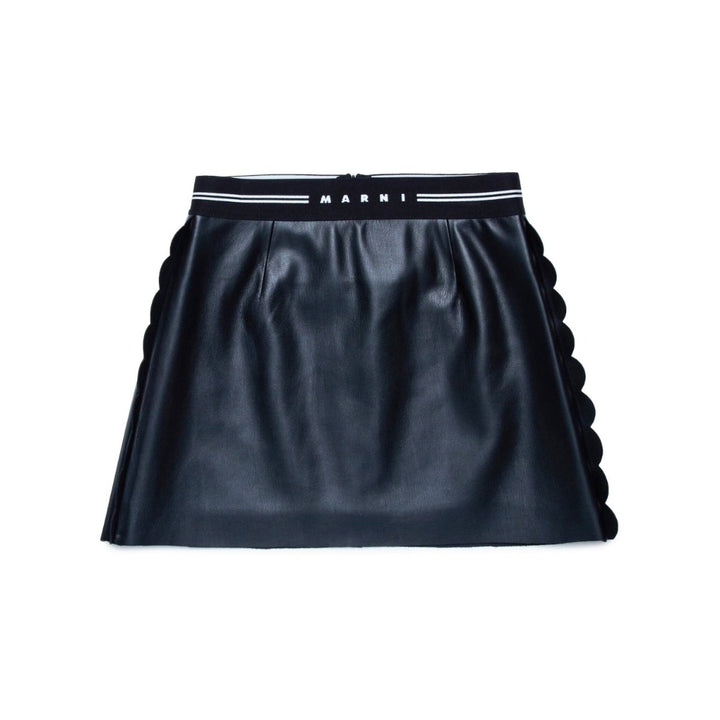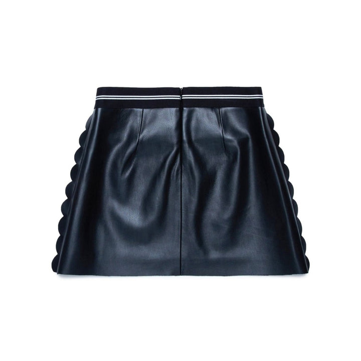 Fake leather skirt. Above-the-knee length. Elastic waistband with institutional logo. Decorative detail on the sides. Zip closure at the back. Lined inside. An original garment, perfect for an extraordinary casual look.