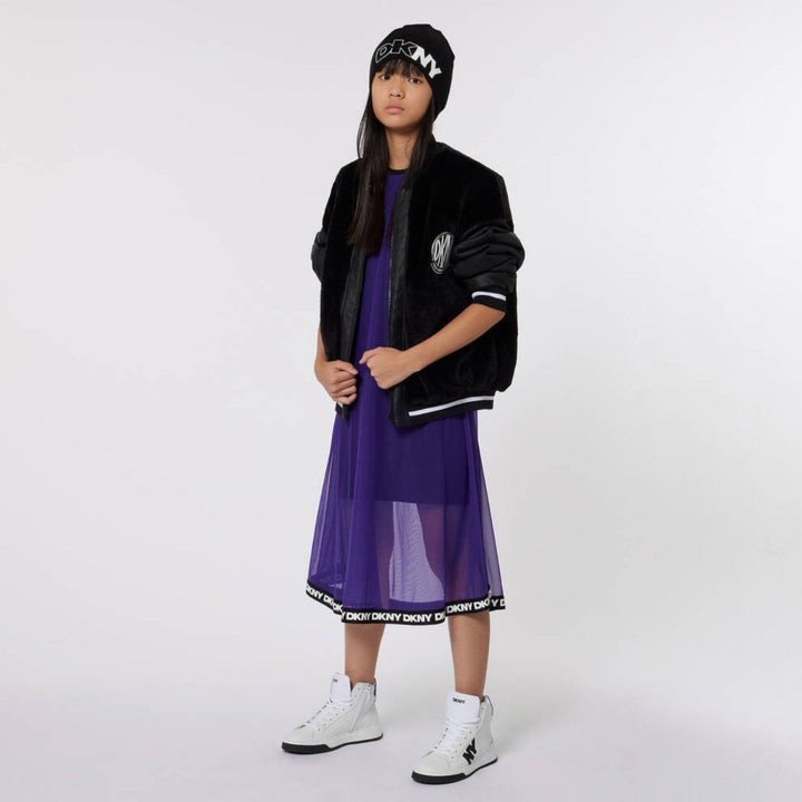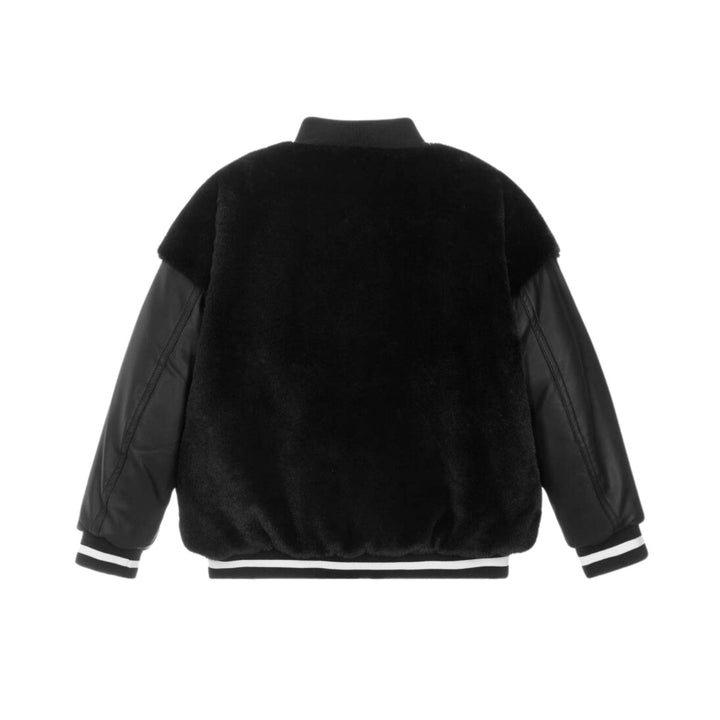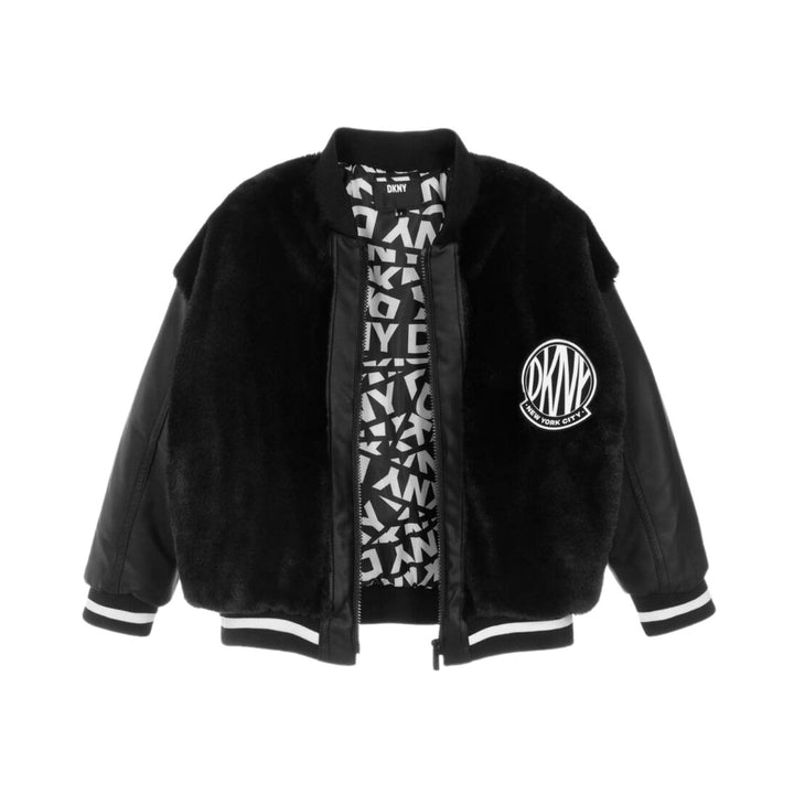 Great for a cool street style, this black bomber jacket is by DKNY. Made from super soft faux fur, it has smooth faux leather long sleeves and a matching panel on the front zip fastening. Ideal for the cooler weather, it has a silky lining, cosy mid-weight padding, useful side seam pockets, and a high ribbed jersey neckline. Stitched with a black and white rubberised logo on the chest, there are striped trims on the cuffs and the hemline to enhance the casual look.