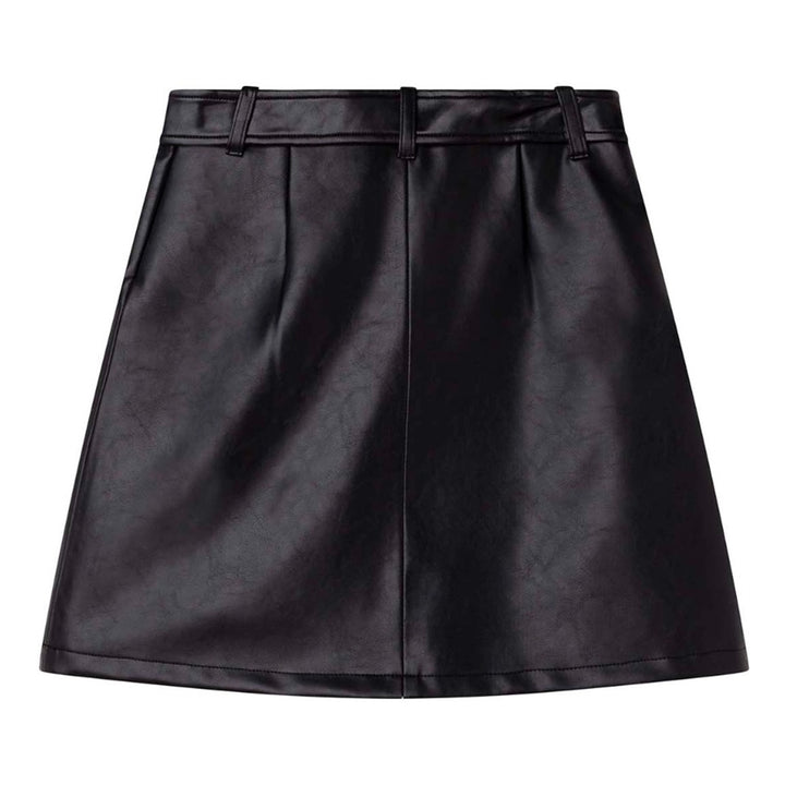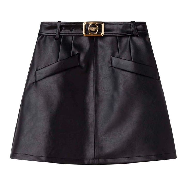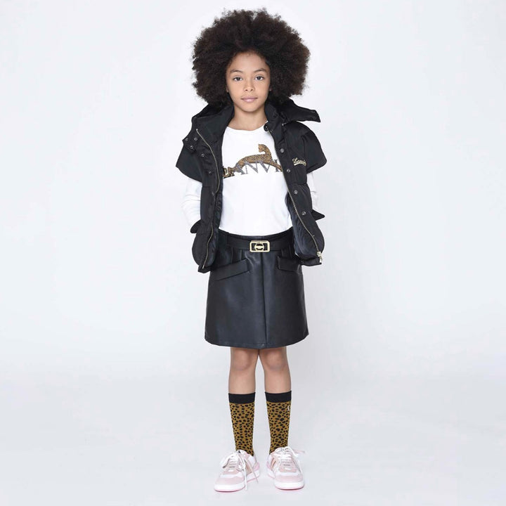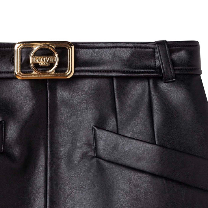 As seen in the main collection, a black faux leather mini skirt for girls by French designer, Lanvin. It has front pockets and a removable, adjustable belt with a gold branded buckle adding a designer style statement. Fully lined for comfort, it fast