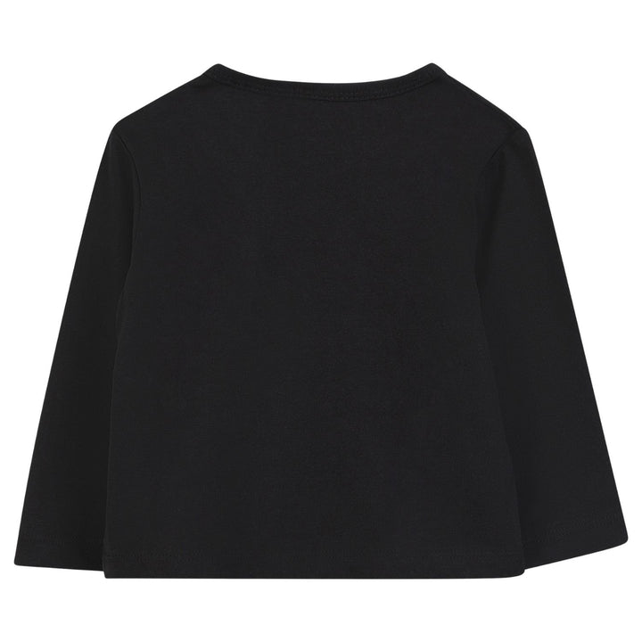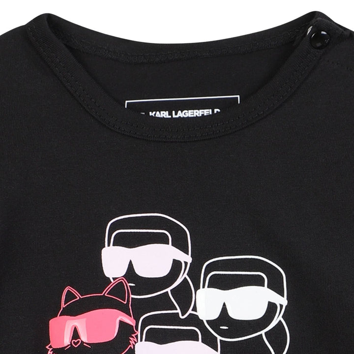 Girls black T-shirt featuring a stylish Karl graphic print, made from soft cotton for a cool and comfy look.