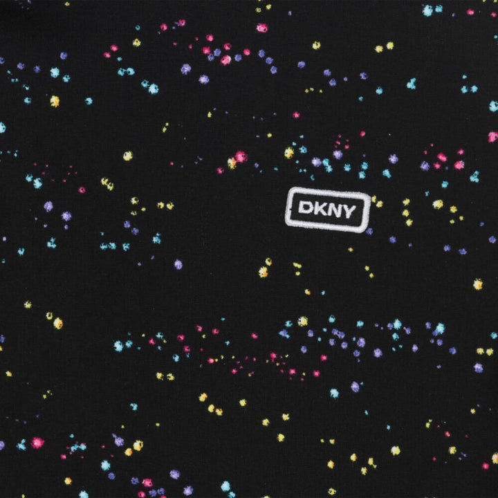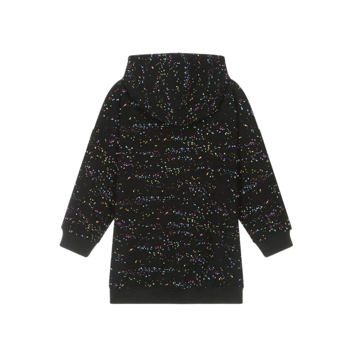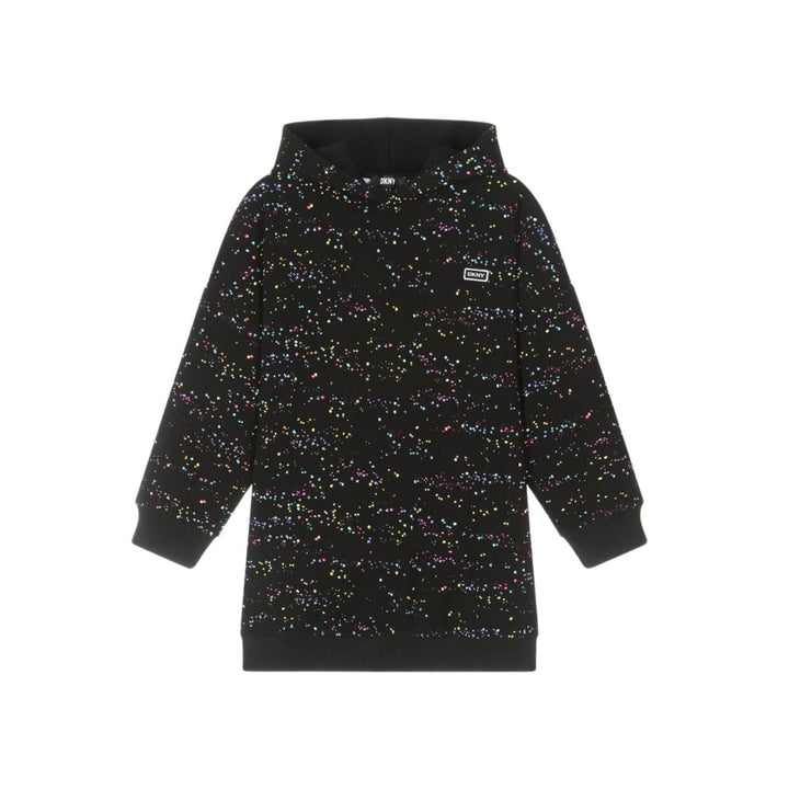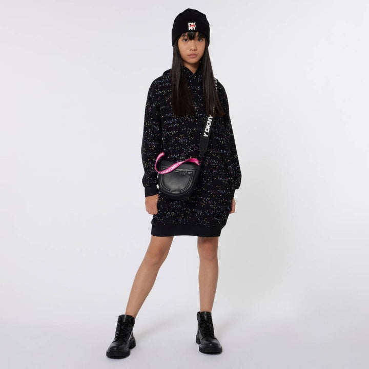 Cool and casual black sweatshirt dress for girls by American streetwear brand DKNY. Designed with a multicolour starlight pattern, this laid-back style is made in stretchy Milano jersey, with an attached hood and ribbed trims. An embroidered logo on the chest adds a finishing designer touch.