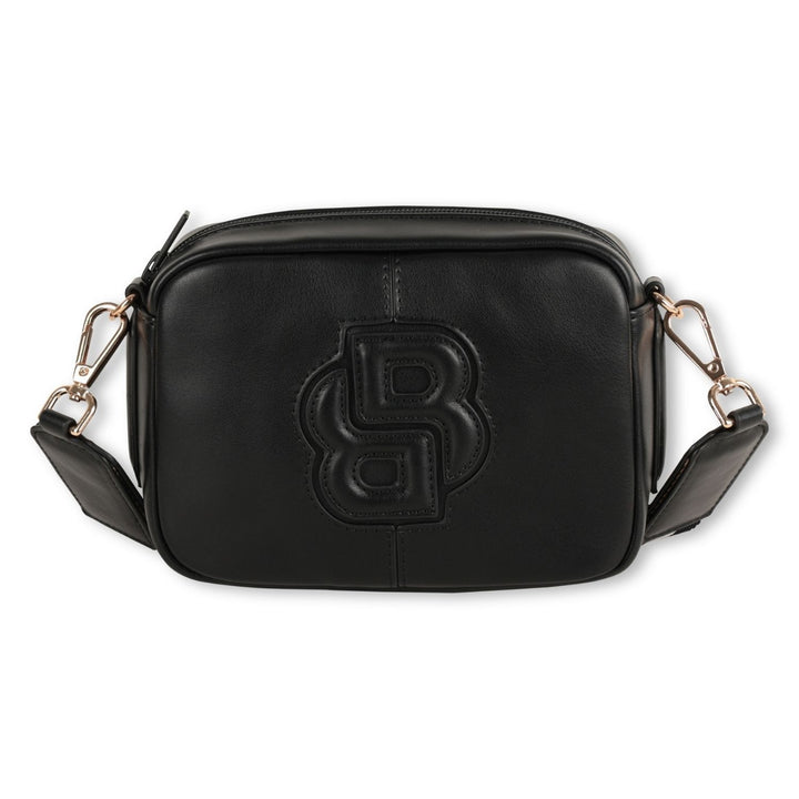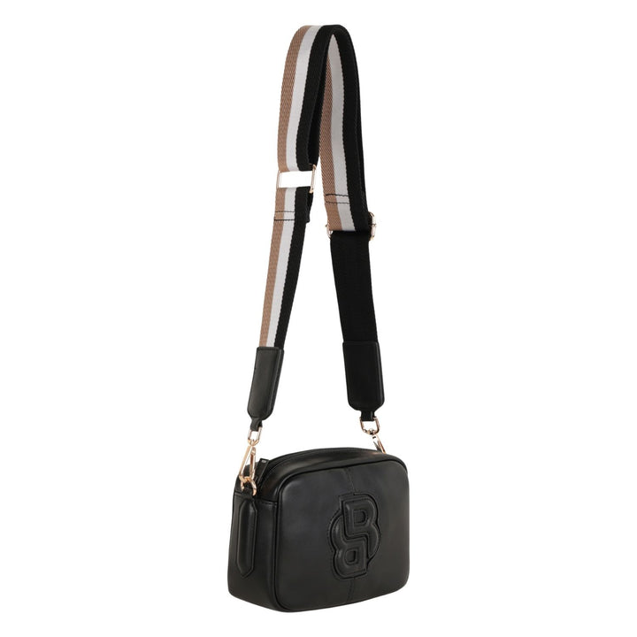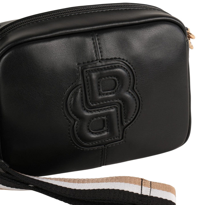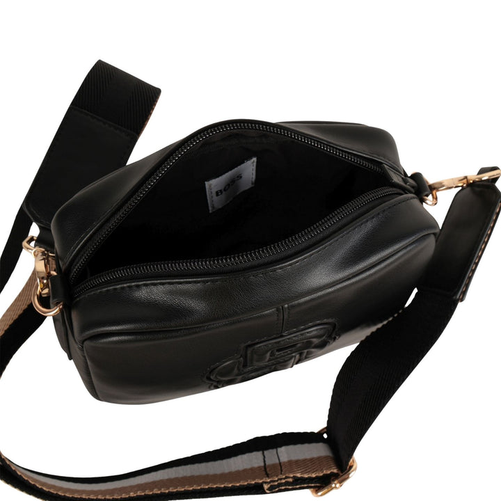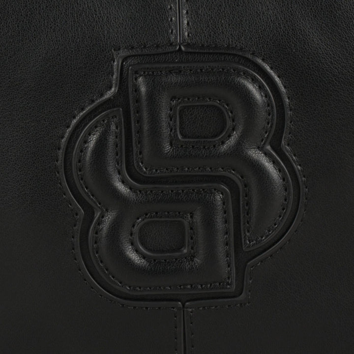 This elegant crossbody bag from BOSS is crafted from smooth black leather and features a bold embossed "B" logo design on the front. It comes with a detachable and adjustable shoulder strap adorned with gold-tone hardware, allowing for versatile carr