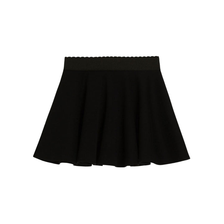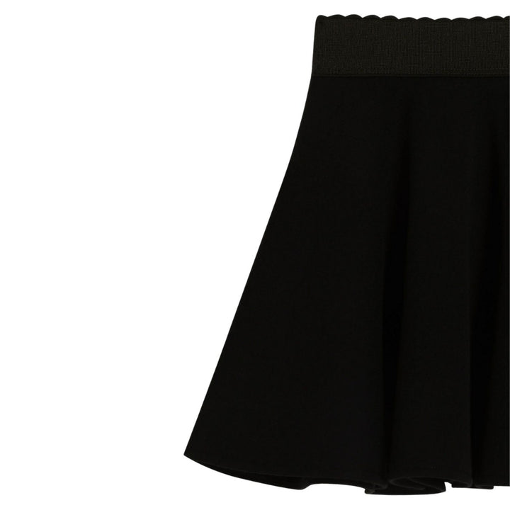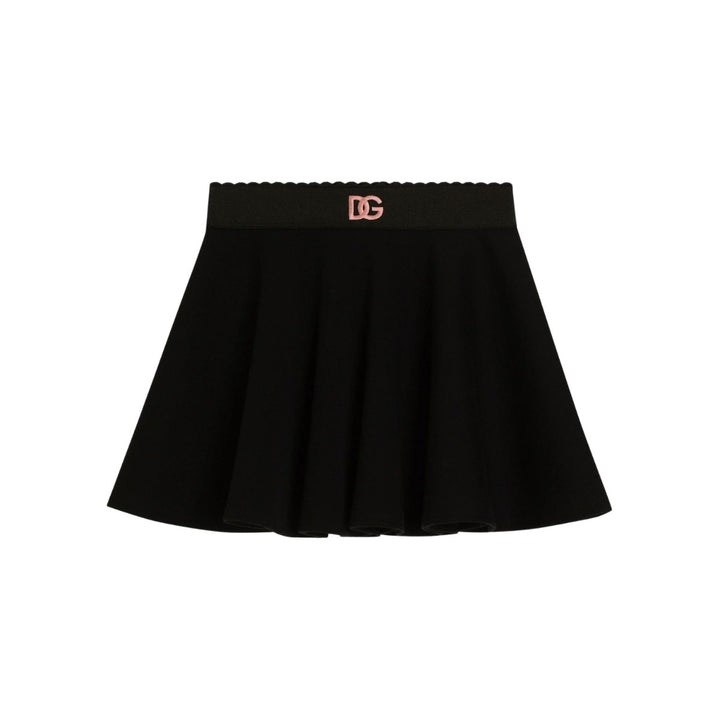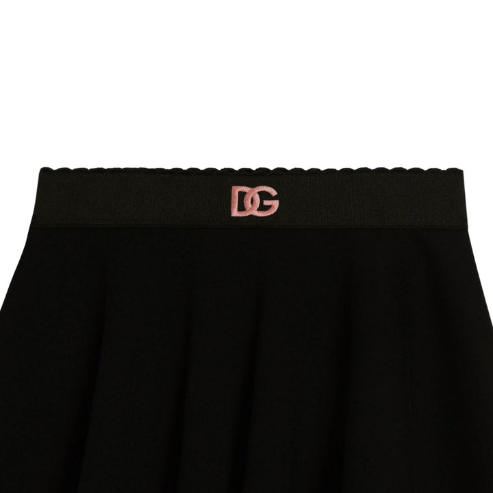Dolce & Gabbana Kids black A-line skirt featuring an embroidered logo, elasticated waistband, and scallop edge. Made in Italy from 100% cotton for a comfortable and elegant fit.