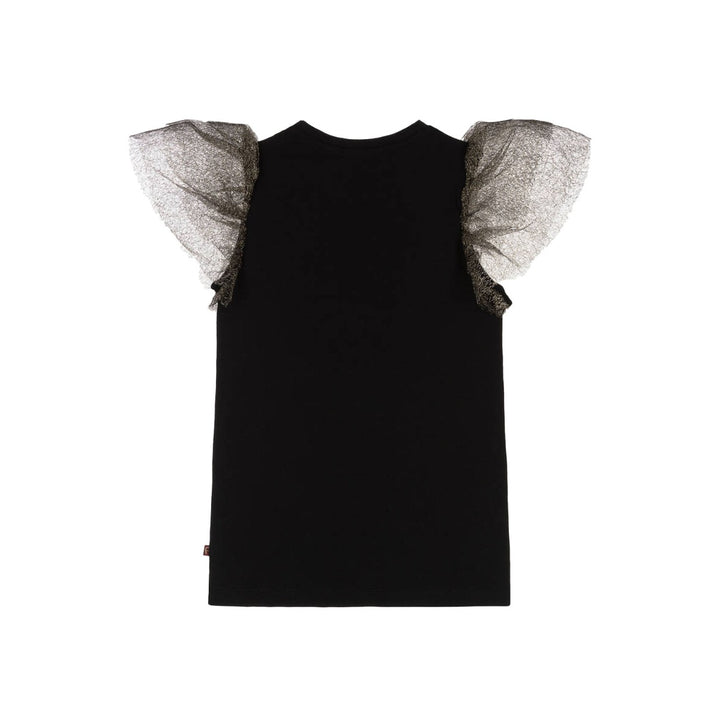 Comfortable and stylish for girls, this black T-shirt from AIGNER is made in soft cotton jersey. Elevating a classic style, it has golden ruffled tulle sleeves and a sparkly gold logo and bag motif on the front, featuring the brand's signature 'A' ho