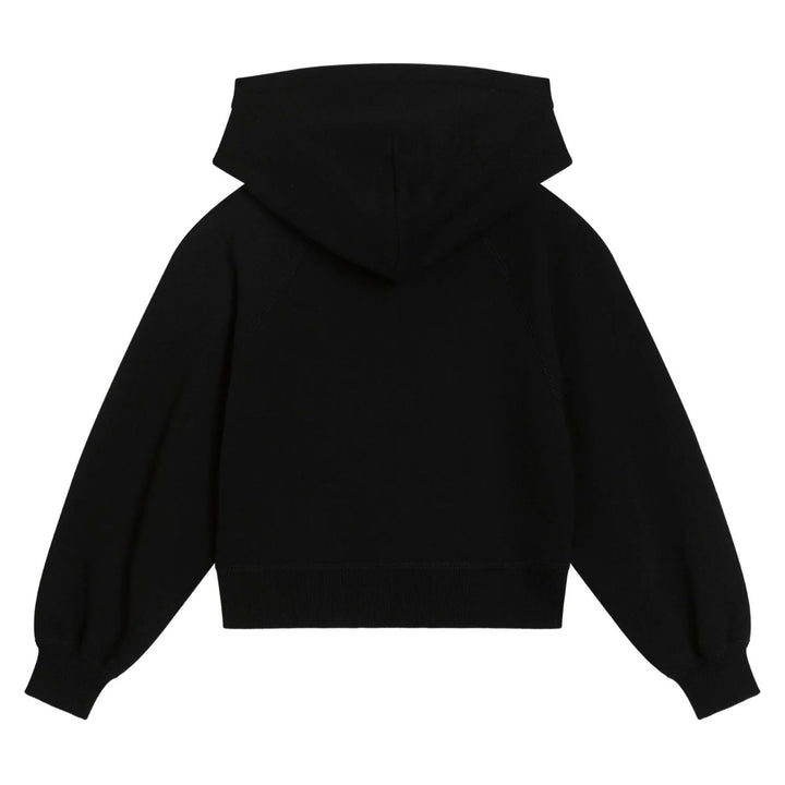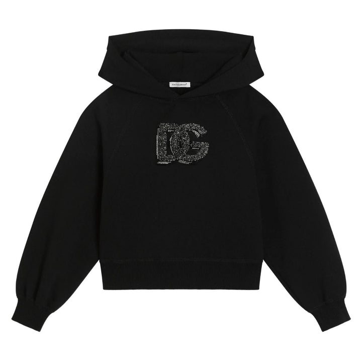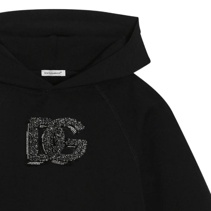 Girls black logo-patch hoodie by Dolce & Gabbana crafted from premium cotton jersey, featuring a soft fleece interior, ribbed trims, and a signature DG logo patch on the chest for a chic and comfortable designer look.