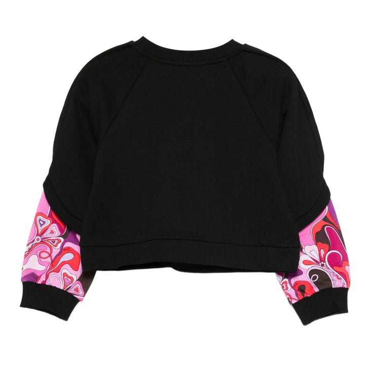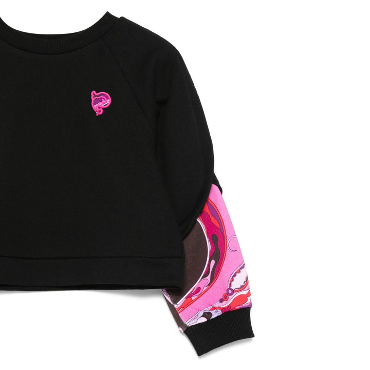 Elevate her casual wardrobe with this girls black sweatshirt from Pucci. Crafted from soft, premium cotton, it features a relaxed silhouette with a classic crew neck and long sleeves. A signature Pucci logo patch adorns the chest, adding a refined de