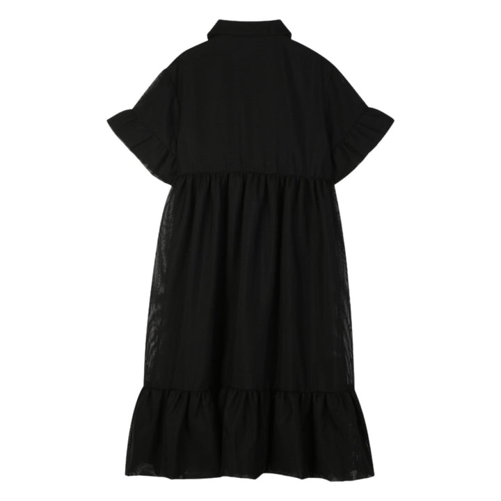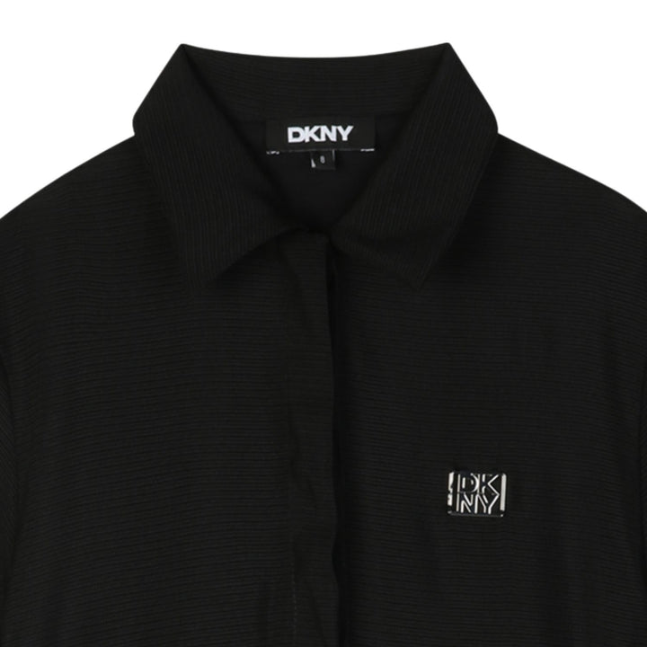 Girls black logo-print flare dress by DKNY a chic everyday essential crafted from soft, stretch cotton jersey. It features a flared silhouette, bold white DKNY logo print across the front, short sleeves, and a round neckline. Perfect for casual outings or stylish playdates, combining comfort with urban elegance.