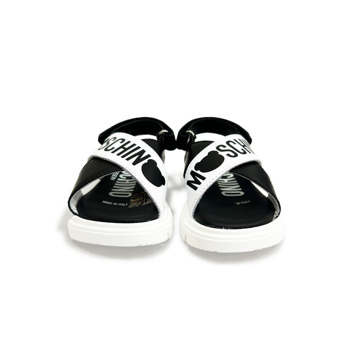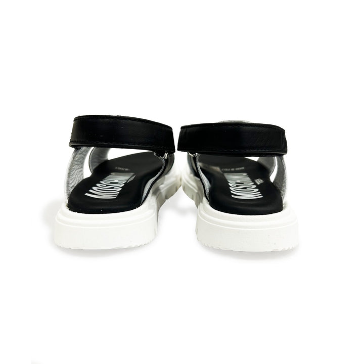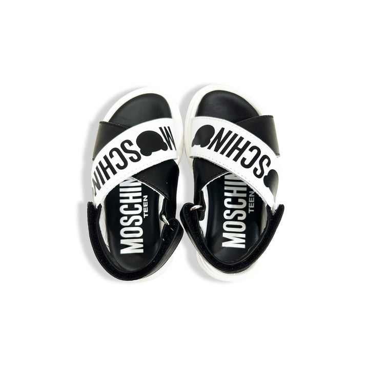 Black leather sandals for girls by luxury Italian designer Moschino Kid-Teen. The soft and supple uppers have an embroidered logo foot strap. Stylish and comfortable, they fasten with an adjustable velcro strap and have a cushioned leather insole and