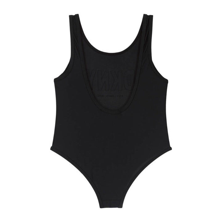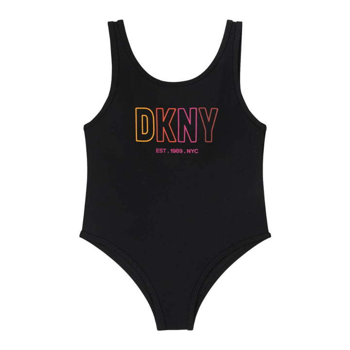 A black swimsuit for girls by DKNY, made in a smooth fabric with a breathable lining. This suit is characterised by a logo print on the chest, in orange, red and pink. It has an elegant scooped back for a contemporary modern style.