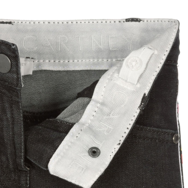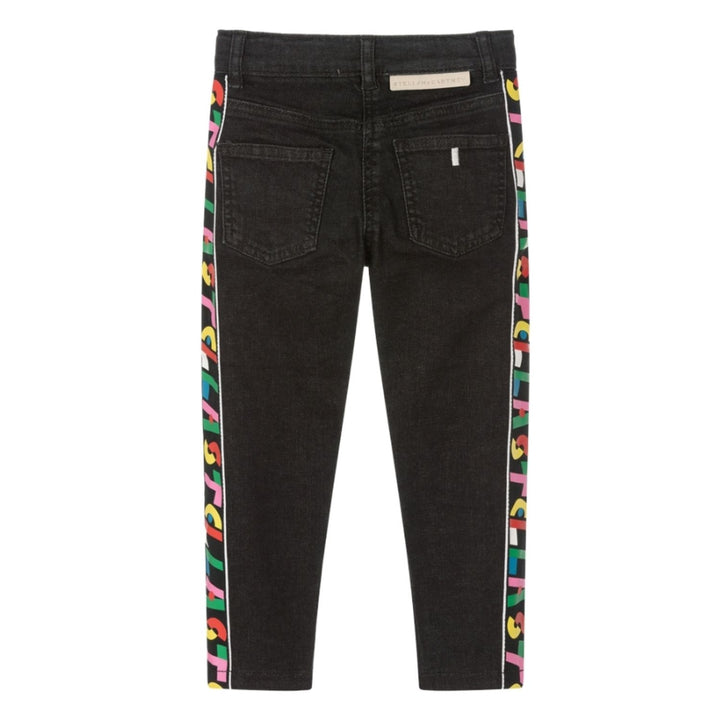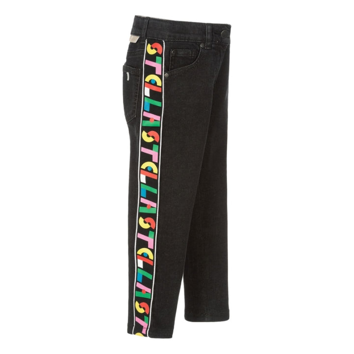 Black denim jeans for girls by British brand Stella McCartney Kids, made in organic cotton. They have colourful grosgrain logo taping down the legs for stand-out, deisgner style. With five pocket styling, they fasten with a logo hook and eye with a z