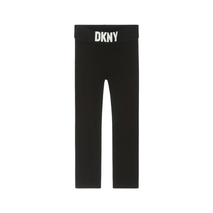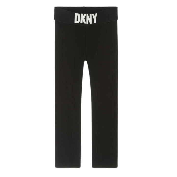 Black full-length leggings for girls by American brand, DKNY. Comfortable for everyday casual pairing, they are made in soft and stretchy organic cotton jersey. For a contemporary look, an eye-catching white logo is printed on the front of the wide e