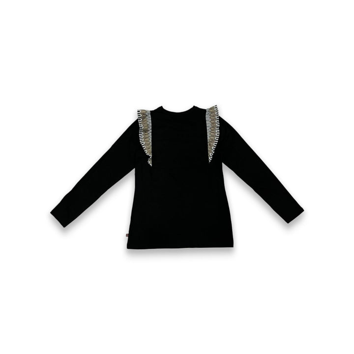 Lovely Black long-sleeved top for girls by AIGNER. Made in soft, stretchy cotton jersey for comfort, this top has an embroidered signature 'A' horseshoe logo on the front and stunning crochet lace ruffles on the shoulder for a designer finish.