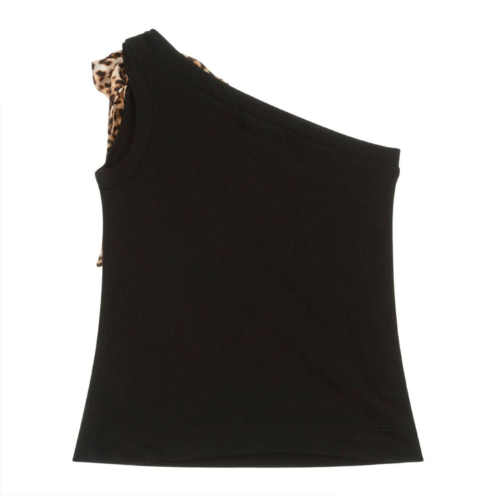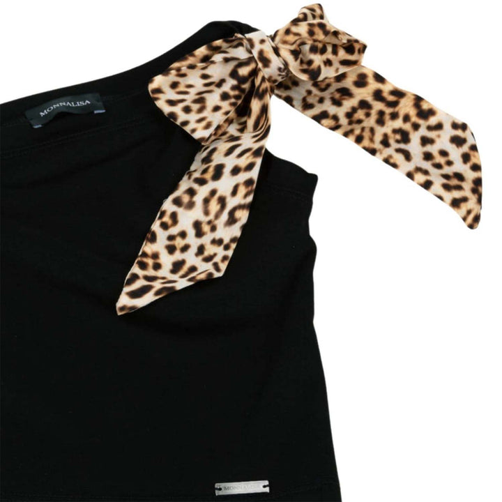 A black asymmetric top for girls by Monnalisa, made in soft, stretchy Milano jersey. Great for parties or stylish casual wear, the top comes with a silky, leopard print sash that can be tied into a bow on the shoulder. A silver metal logo plate adds