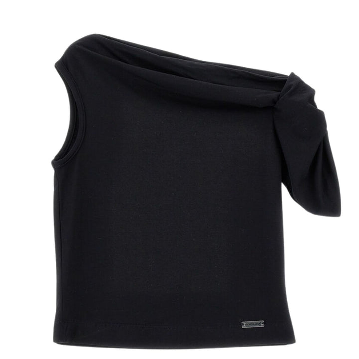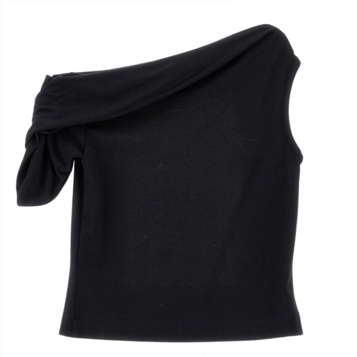 A fashionable alternative to the T-shirt, the asymmetrical, low-cut top with exposed shoulders will appeal to teenagers.
