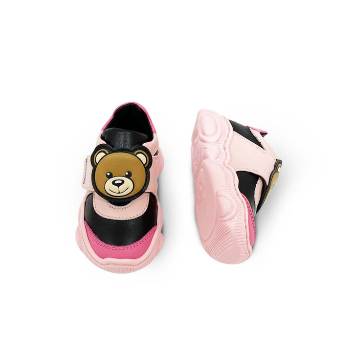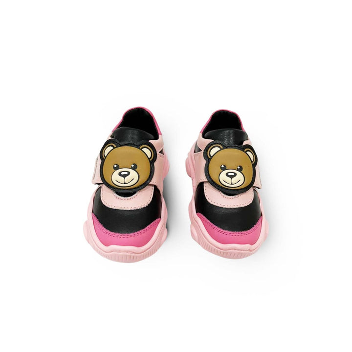 Stylish Black and pink leather trainers for girls by Moschino Kid-Teen. They have a wide, velcro fastening footstrap with the brand's signature Teddy Bear and black logo print. For comfortable wear, they are lined in soft and supple leather, with a c