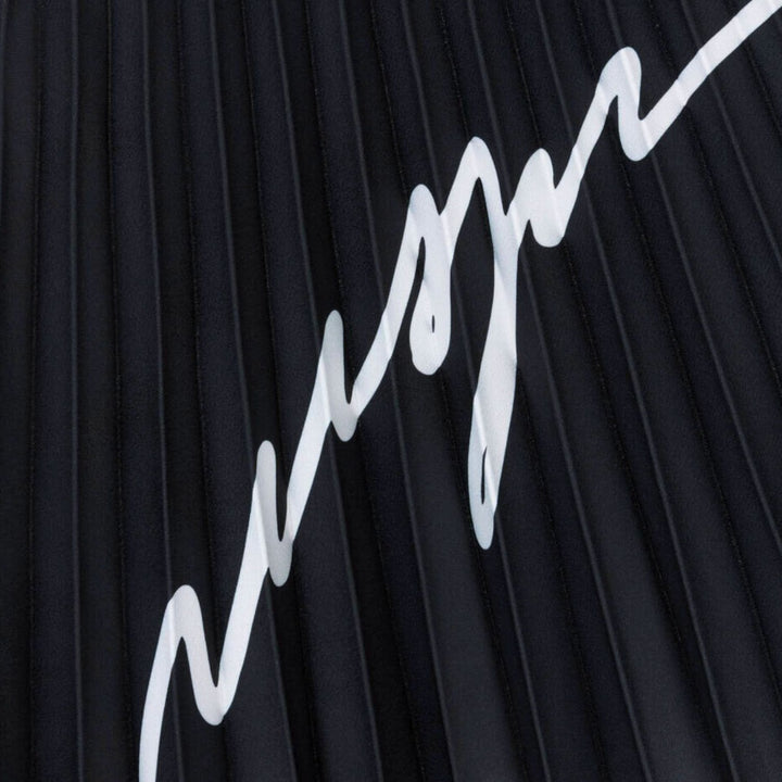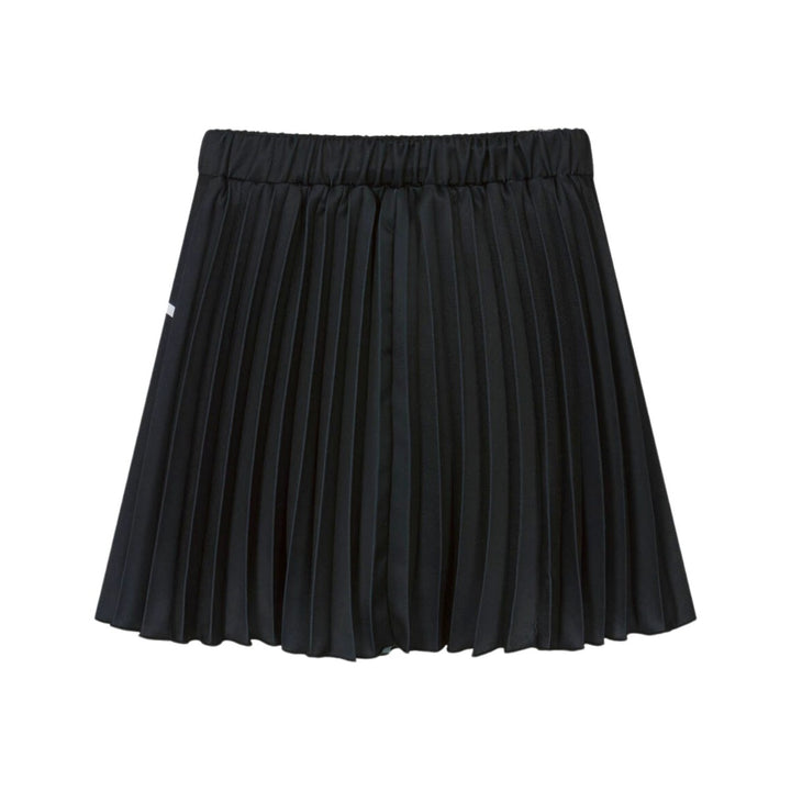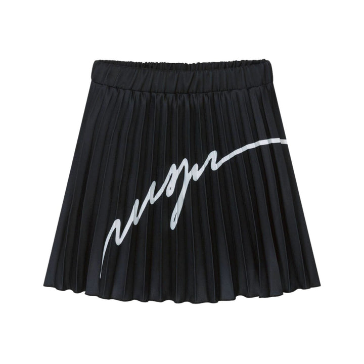 Black pleated crepe skirt for girls by Italian brand MSGM, with a large cursive logo across the front in white for instant designer appeal. With a comfortable, elasticated waistband, it simply pulls up, and there is a super soft viscose lining.