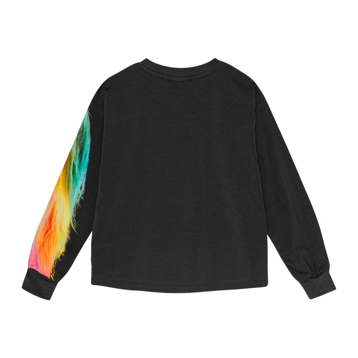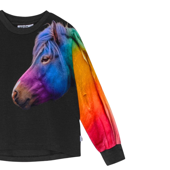 Black long-sleeved t-shirt in organic cotton with a loose fit, round neckline, and ribbed edges. The top is longer at the back than at the front. A rainbow-coloured horse print adorns the left sleeve and front of the top.