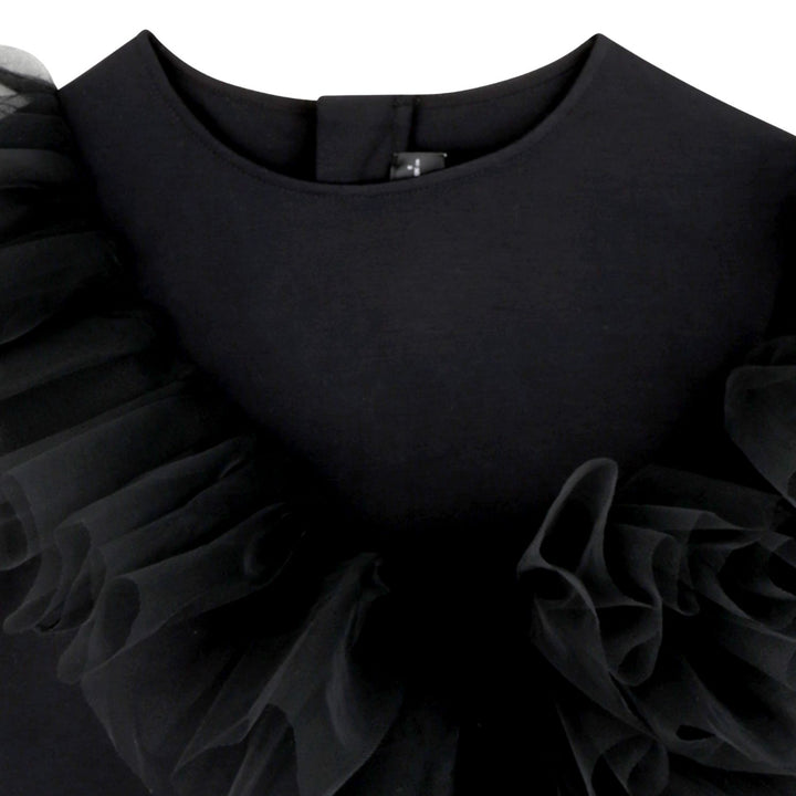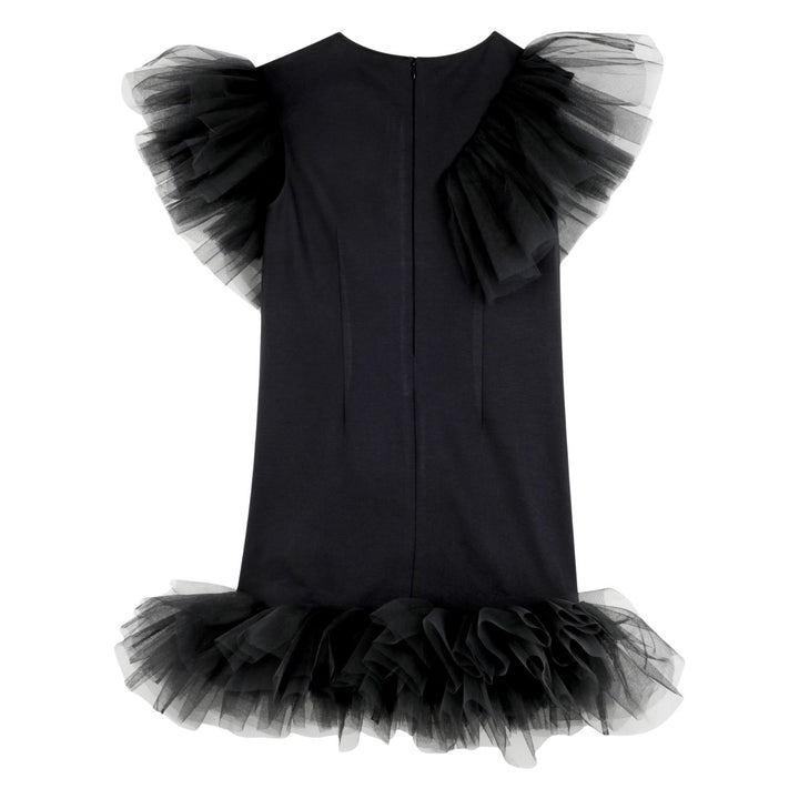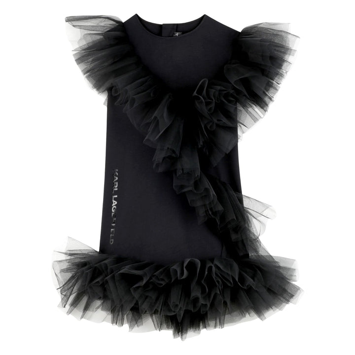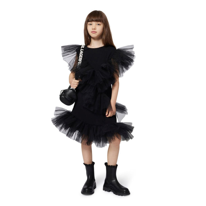 Elegant black ruffled dress for girls by Karl Lagerfeld, featuring a signature logo print and stylish layered detailing.