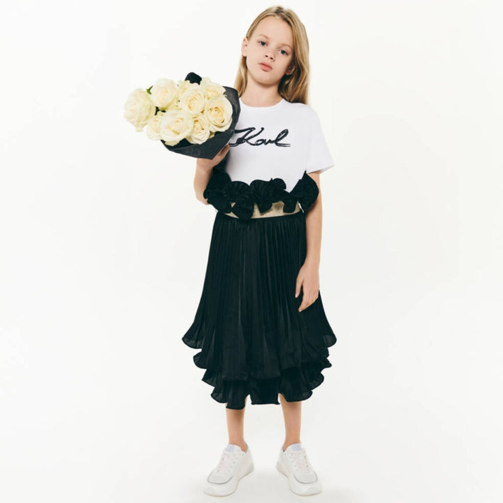 A chic and elegant black pleated skirt for girls by KARL LAGERFELD KIDS. Ideal for a party or special occasion, it features a glittery gold elasticated waist with eye-catching designer branding, and finely woven pleats that cascade gracefully and create a flowy silhouette. The silky satin fabric ensures comfort, while the viscose lining provides a smooth feel against the skin.
