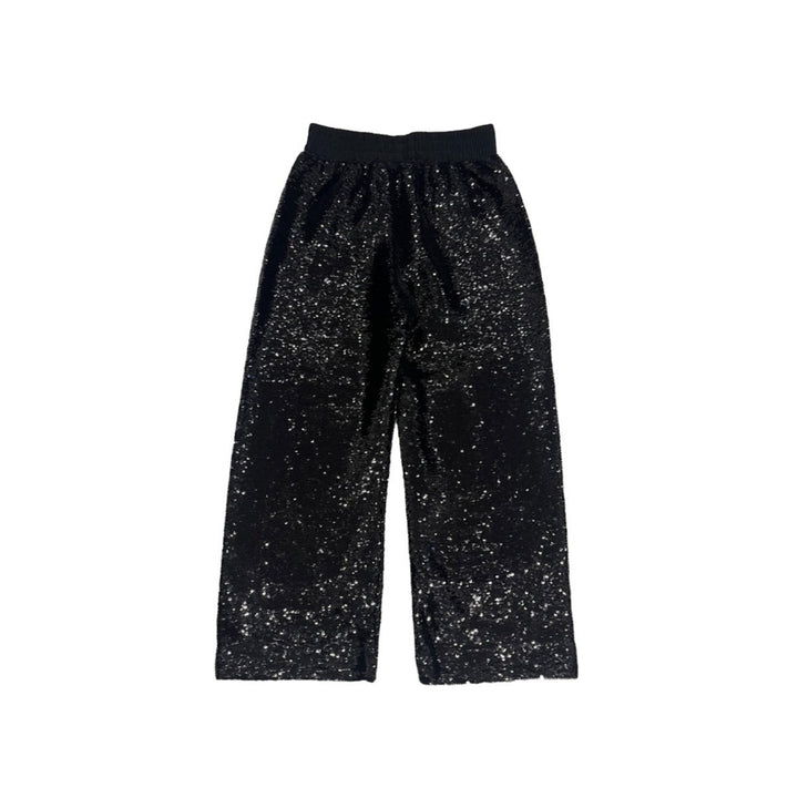 Fabulous black trousers for girls by Monnalisa, covered in sparkling sequins. This stand-out party style has a wide leg fit for extra glamorous impact. They are lined in soft mesh for comfort and have an elasticated waistband, embellished with a shin
