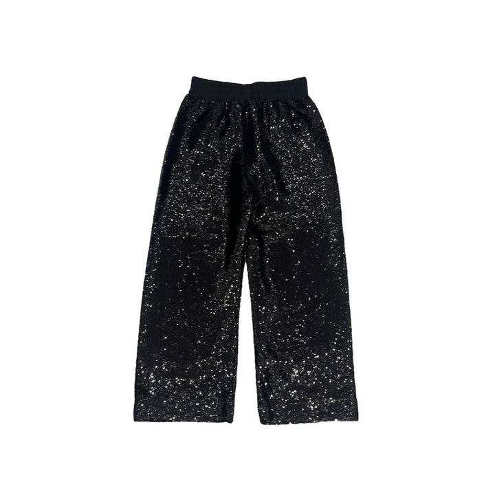 Fabulous black trousers for girls by Monnalisa, covered in sparkling sequins. This stand-out party style has a wide leg fit for extra glamorous impact. They are lined in soft mesh for comfort and have an elasticated waistband, embellished with a shiny silver branded charm.