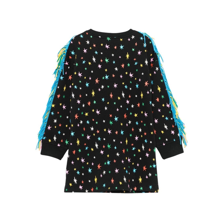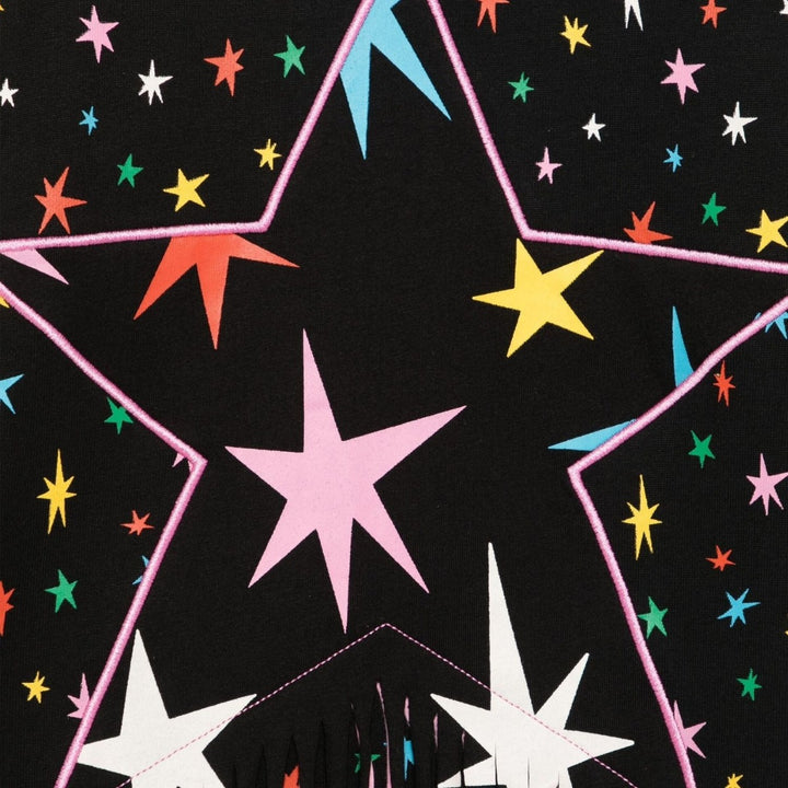 A cool black dress for girls by Stella McCartney Kids. Patterned with colourful stars, it has fun fringing details and a large pink star embroidered on the front. This comfortable style is made in mid-weight organic cotton jersey with a cosy fleece feel inside. The Stella McCartney fit can be quite small so choose a size up if you want room to grow.