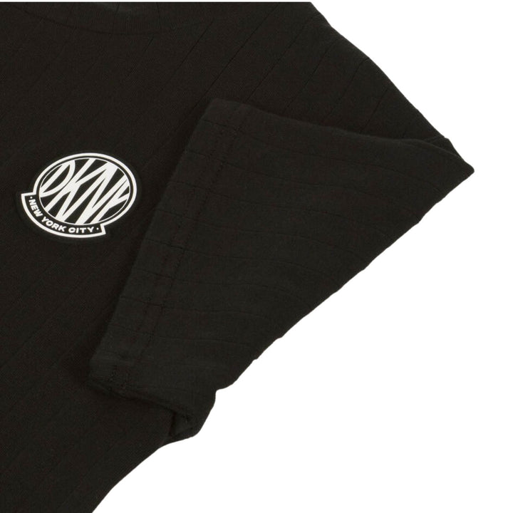 Black cotton T-shirt for girls by American brand DKNY, made in comfortable jersey. A T-shirt with a difference, it is self-striped and has a rubberised black and white logo for instant designer appeal.